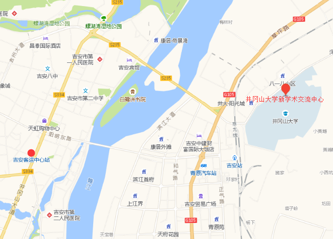 吉安客运中心站:乘12路公交车至井冈山大学站下车(约30分钟,2元),步行至新校门到新学术交流中心;乘出租车至井冈山大学学术交流中心(新校门进左转),约需10分钟,约15元。