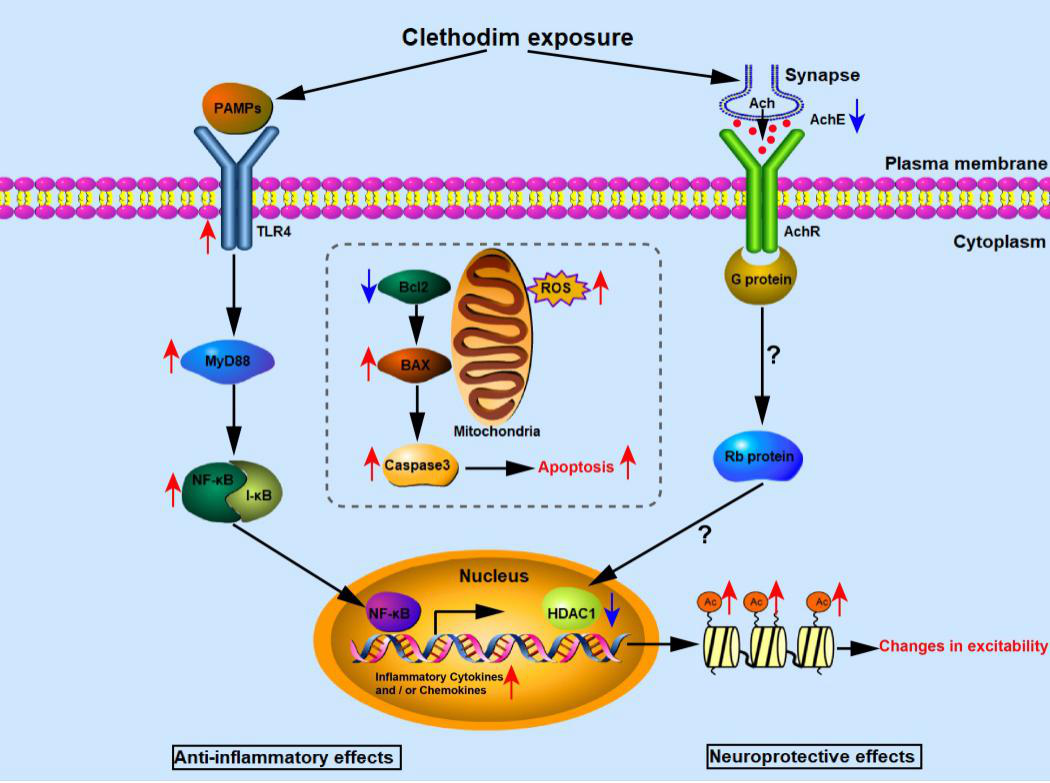 烯草酮是我国农业上广泛使用的除草剂,然而其对水生生物的潜在负面影响仍不清楚。本研究从斑马鱼早期胚胎发育、免疫毒性、细胞凋亡和运动行为等方面展开研究。结果表明,低剂量的烯草酮暴露可显著降低斑马鱼幼鱼的存活率,并导致一系列形态发育异常。其次,烯草酮处理可导致斑马鱼体内中性粒细胞和巨噬细胞的数量明显减少,同时细胞凋亡和氧化应激水平显著增加,并呈现出剂量依赖性关系。在分子机制上,烯草酮(300μg/L)处理斑马鱼72h可以显著上调TLR信号中的关键基因如TLR4、MyD88和NF-κB p65的表达,并且相关的促炎细胞因子如TNF-α、IL-1β、IL8和IFN-γ也被激活。此外,烯草酮还能够明显抑制斑马鱼的运动行为并调控乙酰胆碱酯酶和组蛋白乙酰化水平。本研究将有助于阐明相关农药对水生生物免疫毒性的分子机制。该项工作得到了国家自然科学基金项目(No.81660087 和 81560109)的资助。