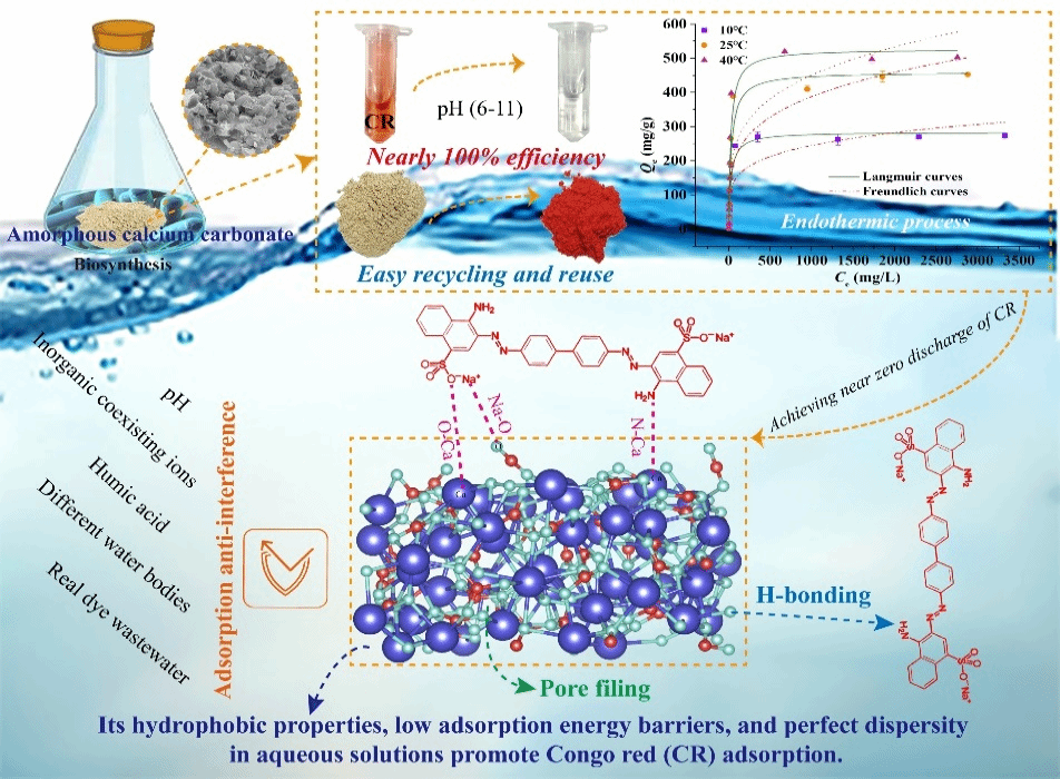 为积极响应国家2030-2060年双碳战略,贺根和教授领衔的功能微生物与污染治理研究团队持续深耕于红壤特色微生物及其衍生矿物资源的价值评估,并致力于开发高效、低碳、资源节约型的环境治理创新理论和策略。微生物诱导的成矿作用在自然界广泛存在,相较于无机化学成矿过程,生物诱导形成的碳酸钙矿物晶体通常为微米或纳米级,形态多样,微量元素成分复杂,具有独特的有机-无机多孔复合层状结构等。贺根和教授研究团队前期的研究成果表明,由微生物诱导合成的碳酸钙是去除有机染料最具前景的吸附材料(Bioresource Technology,2023;Molecules,2024),相比现有的常用吸附材料优势显著。然而,要在确保碳酸钙生物合成的高稳定性,高效性和高重复使用性的同时,实现染料废水的近零排放是一项极具挑战性的任务。为此该研究团队选取实验室从上百份不同区域红壤样品中分离、筛选和驯化的优势菌株—芽孢杆菌LRL007作为实验菌株(已做专利保藏登记),通过不断优化研究体系,利用微生物诱导的成矿作用,制备了一种新型、绿色、高效的非晶态碳酸钙吸附材料。研究团队首次阐明了该生物矿物材料去除有机染料的行为规律及机理,同时探究了不同环境因子对其去除性能的影响及应用潜力。研究结果发现,生物源非晶态碳酸钙能高效去除典型有机染料—刚果红,效率接近100%,即使在复杂水体环境中也展现出极强的吸附抗干扰性和重复利用性,实现了染料废水近零排放的目标。此外,该研究首次证实了该生物源矿物材料对有机染料—刚果红的去除能力要显著高于非生物源碳酸钙及其他常用染料吸附剂(如活性炭、粘土矿物、沸石和其他硅质材料等),同时克服了二次污染问题,突出了生物合成技术的巨大优势。该研究成果不仅具有较高的理论价值,而且在实际应用中也具有重要意义,有助于推动废水治理低碳技术的发展,并为我国染料工业废水的处理提供了一种创新的解决方案。目前,研究团队正在深入开展系列延展性工作,相信很快微生物衍生非晶态碳酸钙技术将应用于实际染料工业废水的处理中。