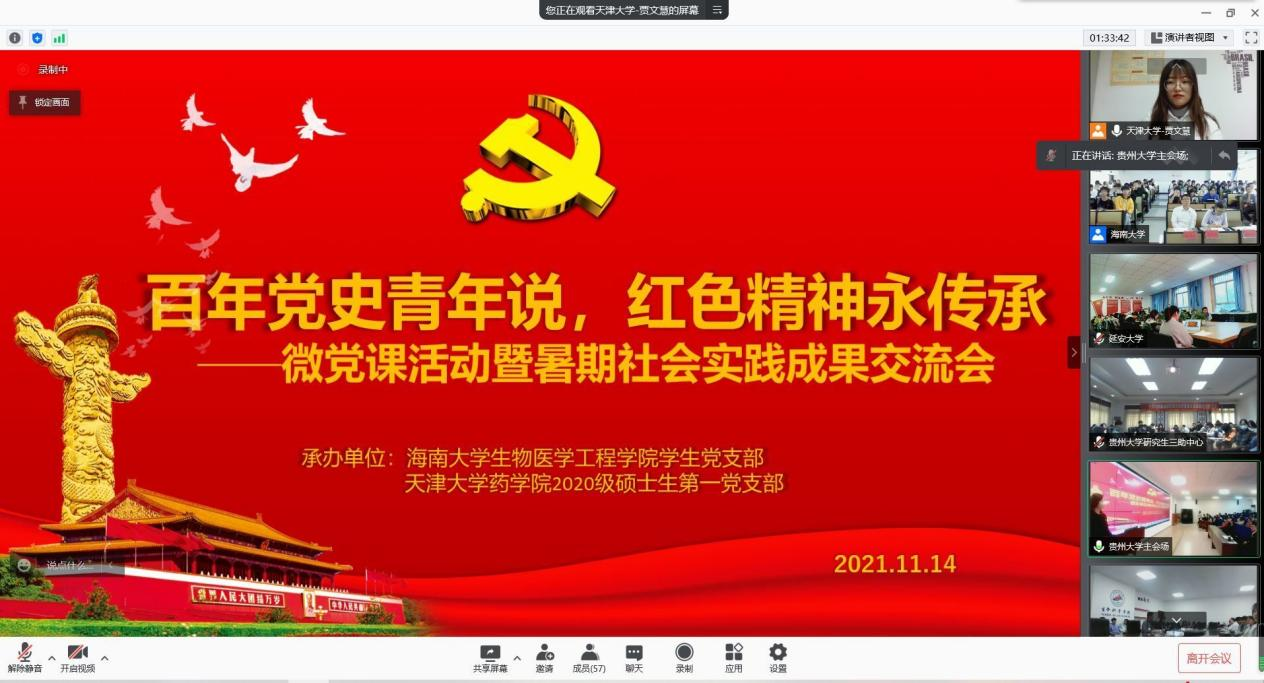 为扎实推进党史学习教育,深化海南大学生物医学工程学院学生党支部与天津大学药学院2020级硕士党支部联学共建,2021年11月4日上午,海南大学生物医学工程学院、天津大学药学院联合海南大学药学院、华东师范大学光华书院、井冈山大学生命科学学院、延安388vip太阳集团、贵州大学研究生三助中心等六校共同开展主题为“百年党史青年说,红色精神永传承”的微党课活动暨暑期社会实践成果交流会。天津大学药学院党委副书记陈乐、辅导员王海英、海南大学生物医学工程学院特邀组织员张延梅、副处级辅导员崔建兵、药学院辅导员谢天宇、延安388vip太阳集团组织员刘登强、井冈山大学生命科学学院团委书记吴丽花、贵州大学党委研究生工作部孟萌、经济学院总支书记张欢欢、华东师范大学光华书院侯静惟出席。活动由由天津大学贾文慧、海南大学江盼主持。