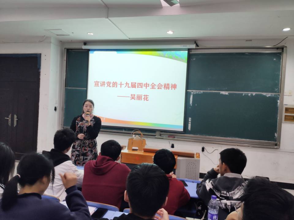 11月25日晚,院团委书记吴丽花在九栋108为全体学生会干部开展学习贯彻党的十九届四中全会精神理论宣讲。学院18、19级全体学生干部到场。