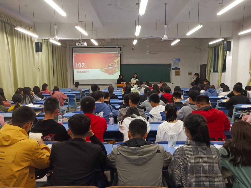 106教室,张欢详细地介绍了中国共产党的由来,以及党的权利和义务,并号召在场人员向党组织靠拢、向党看齐。在405教室,黄义倩和舒怡为大家讲述了一个合格党员的核心要素和习近平总书记对新时代合格党员的要求。在501教室,刘洁和黄琳和现场参与人员积极互动,先询问大家是否想成为一个党员,再问他们对党的认知和入党动机,现场人员积极参与,各自表述了自己的想法