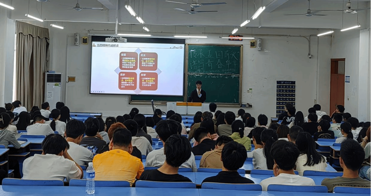 活动开始,郭永发同学主要从“忆史?知五四内涵”、“观今?晓领袖深意”、“习样?汲取榜样力量”、“省己?明人生航道”这四个方面引领同学们深入学习并全面了解“五四”精神。最后他引用习近平总书记的话鼓励同们:“广大青年要继承和发扬五四精神,坚定不移听党话、跟党走,争做有理想、敢担当、能吃苦、肯奋斗的新时代好青年,在推进强国建设、民族复兴伟业中展现青春作为、彰显青春风采、贡献青春力量,奋力书写为中国式现代化挺膺担当的青春篇章。”