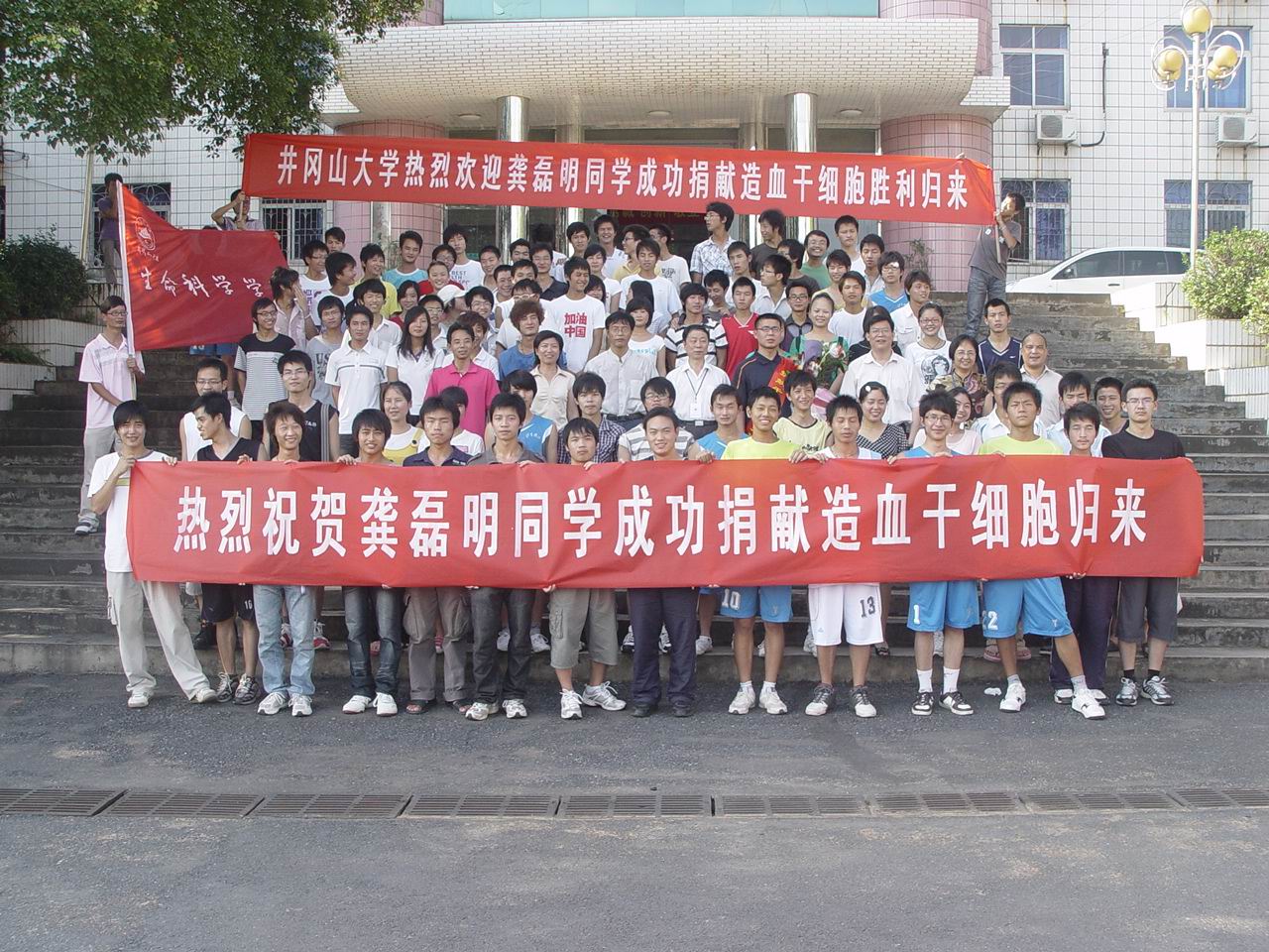 我院07级生物科学班龚磊明同学近日已从西安成功捐献造血干细胞归来。6月30日下午,学校与市卫生局、市红十字会在我校联合举行了欢迎仪式。欢迎仪式由学工处钟风健处长主持。龚磊明同学向大家介绍了捐献的经过,表达了成功捐献的喜悦之情,并着重从捐献过程和捐献结果两方面讲解了捐献造血干细胞对捐献者并无损害,从而消除了大家的疑虑。市卫生局领导和市红十字会副秘书长对龚磊明同学乐于奉献的仁者情怀表达了由衷的敬意,对我校的精心培育表示感谢。我院党委副书记肖南首先祝贺龚磊明同学成功捐献归来。她说,龚磊明同学的行为突出表现了当代优秀大学生的高尚情操和青春风采,是我们学院和学校的骄傲。肖书记号召广大同学要以龚磊明同学为榜样。学子们对龚磊明同学的无私捐献十分钦佩,表示要认真学习这种精神并使之发扬光大。