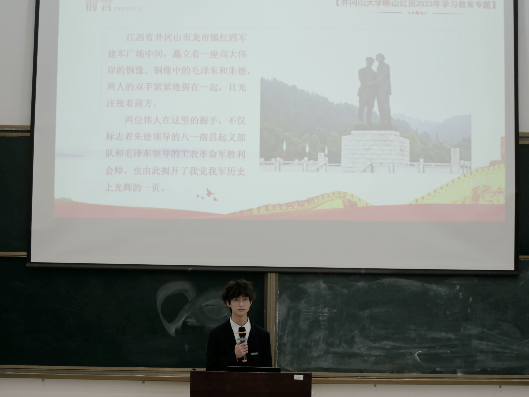 本次活动在奏唱国歌中拉开序幕,何旭梅介绍了井冈山胜利会师的重要意义、历史地位。黄志成以微党课的形式,从井冈山市龙市镇红四军广场中的一座高大伟岸的铜像导入主题,继而从井冈山会师的概况、背景、进程、意义等八个部分带领全体成员学习了井冈山会师的历史。全体成员一起观看《光影礼赞百年——井冈山精神》视频,更为直观地了解了井冈山会师过程中发生的红色故事。